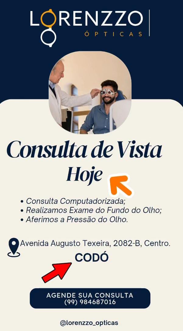 Publicidade Nesta quarta-feira (8) você realiza a sua consulta de vista na Lorenzzo Òpticas. Agende a sua consulta 08/11/2023 11:39