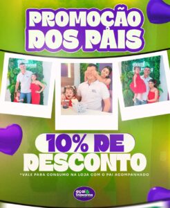 O Açaí e Shawarma 🌯🥣 está com uma promoção imperdível em comemoração ao dia dos pais. Na compra do seu lanche, você ganha 10% de desconto. Atenção! a promoção só é válida para consumo no estabelecimento e acompanhado do pai.