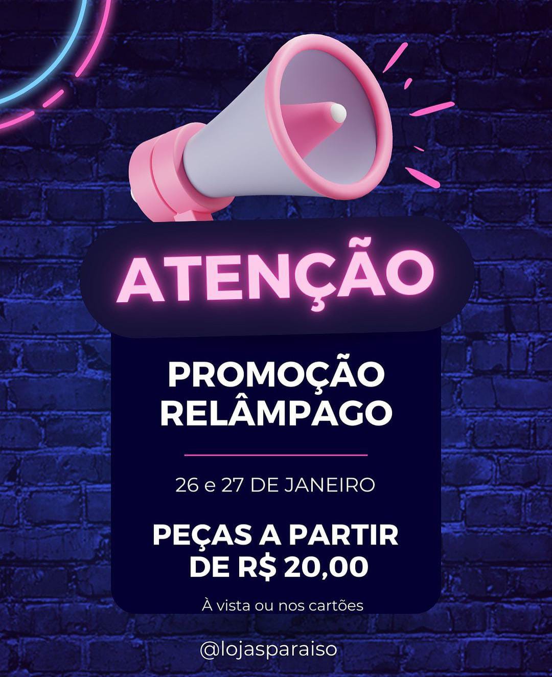 Publicidade Atenção para promoção relâmpago das Lojas Paraíso. Venha aproveitar as ofertas! 25/01/2024 10:39