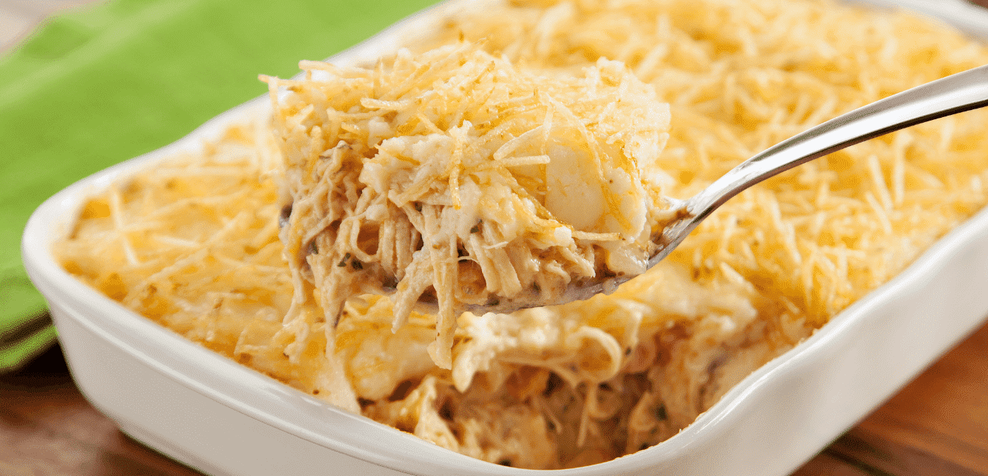 3. Coloque o refogado numa assadeira, cubra com mussarela e espalhe a batata palha por cima.